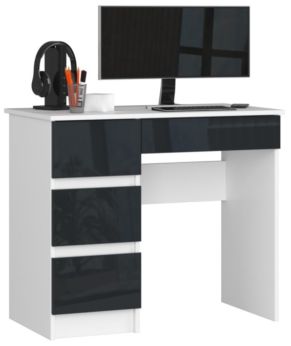 Minimalistyczne biurko A-7 90 cm. (lewe) w uniwersalnej tonacji, którego grafitowe fronty charakteryzują się wysokim połyskiem, to produkt, do którego można dopasować inne elementy wyposażenia pochodzącej z tej samej kolekcji - pojemne szafy, funkcjonalne regały oraz różnej wielkości komody.