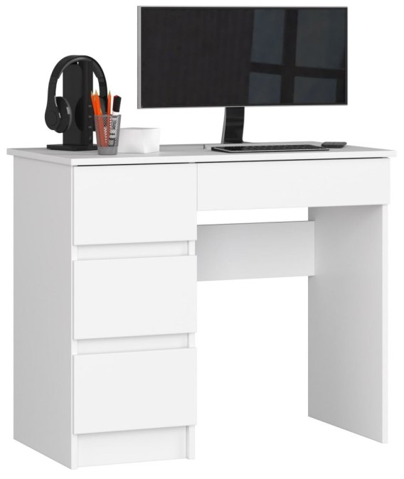 Biurko wyposażone zostało w cztery praktyczne szuflady, które sprawnie i cicho poruszają się na metalowych prowadnicach kulkowych, dzięki czemu bardzo łatwo się je otwiera i zamyka. Fronty szuflad prezentują się elegancko, ponieważ także zostały wykonane z płyty laminowanej w białym kolorze. Umieszczone zostały one po lewej stronie, co jest praktycznym i funkcjonalnym rozwiązaniem.