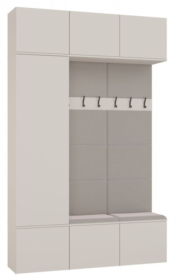 Zestaw HAGA III 1SZ2W to propozycja dla tych, którzy potrzebują więcej przestrzeni do przechowywania, nie rezygnując z nowoczesnego wyglądu. To gotowe, kompletne rozwiązanie do przedpokoju, łączące pojemny moduł szafy z drążkiem i półkami oraz 2 moduły z wieszakiem, tapicerowanym siedziskiem i szafkami.