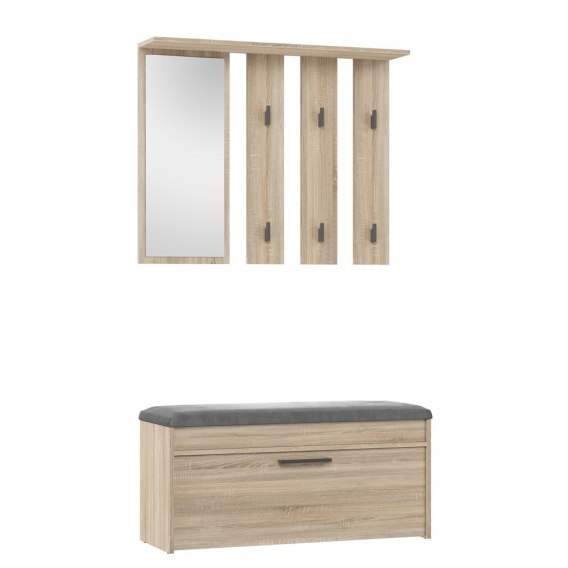 Zestaw wieszak z lustrem + szafka na obuwie z siedziskiem i schowkiem.