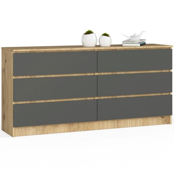 Komoda to jeden z najbardziej praktycznych i najchętniej wybieranych mebli pokojowych oraz biurowych. Nic dziwnego - zapewnia ona miejsce do przechowywania wielu zróżnicowanych artykułów. Nowoczesna komoda K 160 cm. w kolorze dąb artisan/grafit szary to interesująca propozycja skierowana do osób, które preferują prostotę i elegancję w najlepszym wydaniu. Mebel został zaprojektowany w przemyślany sposób i wykonany z wielką starannością. Na uwagę zasługują dobrej jakości materiały, stanowiące gwarant trwałości oraz odporności na ewentualne uszkodzenia. Komoda została wyposażona w sześć pojemnych szuflad. Blat o długości aż 160 centymetrów może służyć do wyeksponowania różnego rodzaju elementów dekoracyjnych, książek, kwiatów, ramek na zdjęcia. Może być również wykorzystany pod telewizor - wszystko zależy od indywidualnych potrzeb.