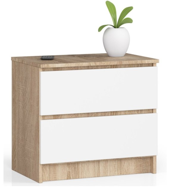 Połączenie gustownego koloru dąb sonoma i klasycznej bieli to świetny wybór dla wszystkich, którzy szukają eleganckiego i ponadczasowego designu. Taki też styl prezentuje komoda K60, która może pełnić funkcję małego i zgrabnego schowka w przedpokoju, salonie czy pomieszczeniu biurowym, a także solidnej i praktycznej szafki nocnej w sypialni. Wyposażona w dwie pojemne szuflady, znakomicie prezentować się będzie w dowolnym miejscu w domu czy mieszkaniu!