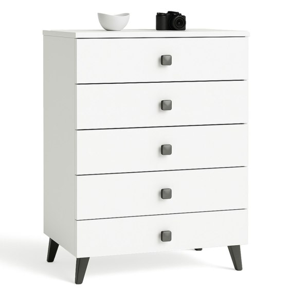 Niewielka komoda to element wyposażenia, który znajdzie zastosowanie w każdym pomieszczeniu. Nowoczesne barwy, solidna konstrukcja i staranne wykonanie zaowocowało powstaniem szafki, która sprawdzi się na przykład w przedpokoju, pokoju dziennym czy młodzieżowym, a także w sypialni. Może być wykorzystana również w pomieszczeniu biurowym, gdzie umożliwi przechowywanie licznych dokumentów oraz innych artykułów o charakterze biurowym. Komoda składa się z 5 szuflad. Mebel łączy w sobie kolorystykę białą i czarną.