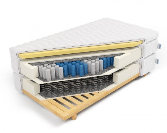 Materac Altea - 3-warstwowa budowa: aż 5cm pianki memory + sprężyny kieszeniowe 7 stref + bonell na stelażu. Maksymalna miękkość i dopasowanie do ciała.