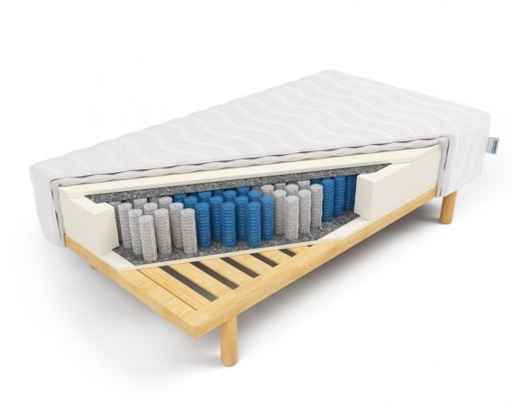 - Szukasz gotowego rozwiązania z 7 strefami - Materac + stelaż + nóżki w jednym. Sprężyny kieszeniowe z 7 strefami twardości dla optymalnego podparcia.