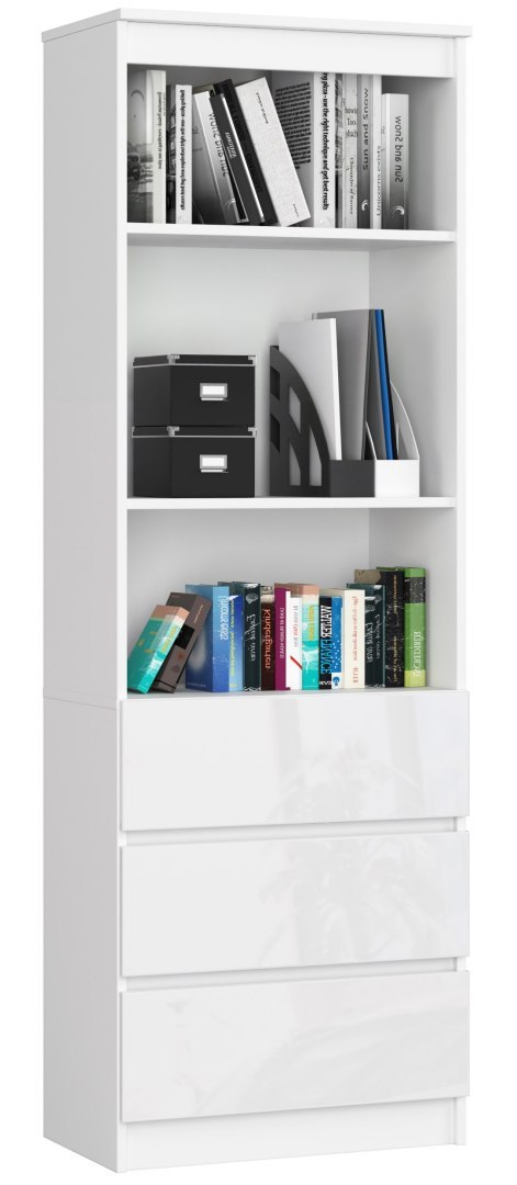 Uniwersalna, achromatyczna barwa bieli powoduje, że regał biurowy z dwiema półkami oraz trzema szufladami będzie meblem z łatwością wpasowującym się w różnorodne aranżacje: od nowoczesnych wnętrz inspirowanych skandynawskim designem po bardziej klasyczne przestrzenie utrzymane w spokojnym klimacie. Wykonany z płyt laminowanych marki Kronospan o podwyższonej odporności na ścierania, a także zabezpieczony na krawędziach obrzeżem ABS, które zapobiega przypadkowym uszkodzeniom, regał na długo zachowuje elegancki i efektowny wygląd, nawet w przestrzeniach biurowych i korzystaniu z niego przez wiele osób. Wygodna, funkcjonalna konstrukcja z dwiema półkami, które można zamontować na różnych wysokościach, a także trzema szufladami mieszczącymi różnego rodzaju drobiazgi czy dokumenty chronione przed niepowołanymi oczami powoduje, że regał biurowy ułatwia utrzymanie porządku i przechowywanie nawet nietypowych formatów. Wykonany na wysoki połysk regał będzie udanym zakupem dla klientów ceniących elegancję i dbałość wykończenia.