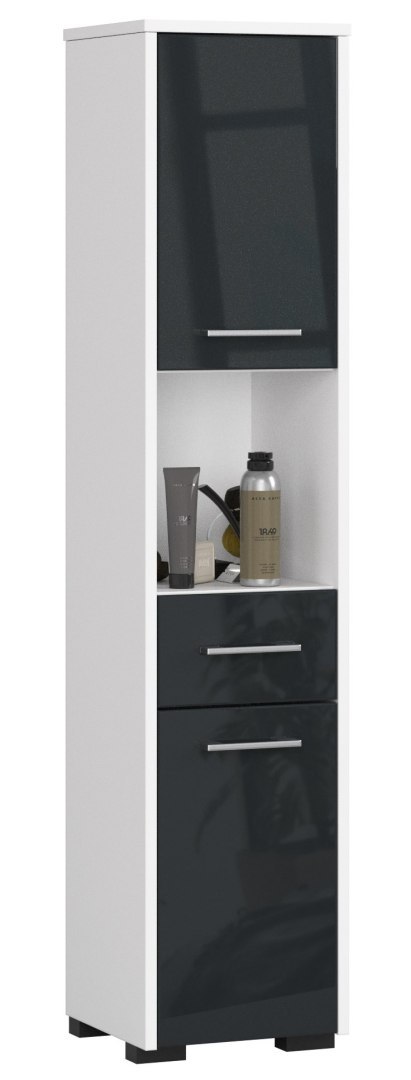 Słupek łazienkowy FIN2 posiada dwie szafki z pojedynczą półką w środku, jedną szufladę na metalowych prowadnicach oraz wnękę nad nią. Mebel stoi na czterech nóżkach, które kolorystycznie idealnie komponują się z ciemnymi, błyszczącymi frontami szafek.