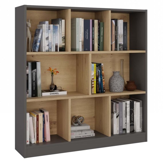 Dzięki 8 pojemnym i proporcjonalnie rozmieszczonym przegrodom, regał FIESTA 8P umożliwia estetyczne przechowywanie książek, dokumentów, ozdób czy pudełek. Dekoracyjne połączenie głębokiego antracytu z ciepłym drewnem dębu artisan dodaje wnętrzu nowoczesnego, a zarazem przytulnego charakteru.