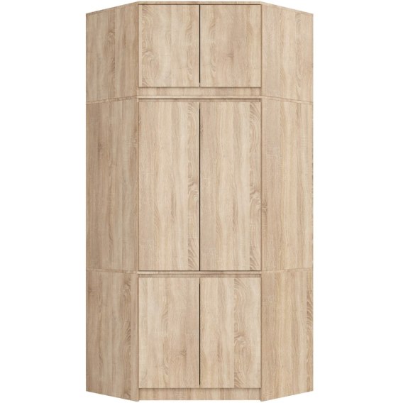 Szafa narożna z nadstawką ubraniowa sześciodrzwiowa wykonana została z odpornej na ścieranie płyty laminowanej Kronospan. Korpus mebla stanowi płyta w kolorze dąb sonoma, fronty pokryte są laminatem w kolorze dąb sonoma. Szafa składa się z 2 segmentów. Dolny to cztery drzwi, 6 półek oraz drążek na ubrania wiszące. Umieszczony najwyżej segment stanowi nadstawka zamykana dwojgiem drzwi. Nadstawka wyposażona jest w 3 półki.