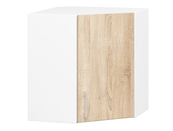 Podczas meblowania pomieszczeń najwięcej problemów sprawiają narożniki pomieszczeń. Z jednej strony nie da się w nich ustawić lub zamontować szafki prostopadłościennej gdyż nie da się otworzyć w pełni jej drzwiczek bez uszkodzenia mebla. Z drugiej strony pozostawienie niewykorzystanej powierzchni jest nieeleganckie i mało funkcjonalne. Problem jest na tyle częsty, że opracowana została szafka kuchenna narożna wisząca. Charakteryzuje się ona tym, że idealnie daje się wpasować do rogu pomieszczenia. To co było problemem teraz okazało się zaletą, gdyż szafka kuchenna narożna wisząca jest znacznie bardziej pojemna od innych szafek wiszących. Standardowe szafki wiszące mają głębokość 30 cm. Szafka kuchenna narożna na ścianki, którymi przylega do rogu pomieszczenia o długości aż 56 cm! Mebel wykonany jest z płyty laminowanej. Dostępne są dwa rodzaje okleiny: biała i Dąb Sonoma. Obie wersje kolorystyczne są łatwe do utrzymania w czystości. Obrzeże wykończone jest okleiną ABS co powoduje, że jest ono odporne na uszkodzenia mechaniczne.