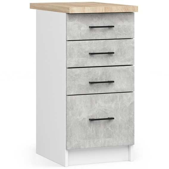 Biała szafka kuchenna z blatem w kolorze dąb sonoma i frontami w kolorze betonu przeznaczona jest do zabudowy modułowej. Prezentowany model składa się z czterech pojemnych szuflad, które pozwolą na przechowywanie wszelkich niezbędnych w kuchni artykułów - począwszy od sztućców, przez naczynia, środki czystości, aż po artykuły spożywcze. Szafka stanowi połączenie betonowych frontów oraz czarnych uchwytów. Ponadczasowy, uniwersalny charakter mebla sprawia, że może on zostać wykorzystany w każdej kuchni - zarówno tej nowoczesnej, jak i zaaranżowanej w tradycyjny sposób.