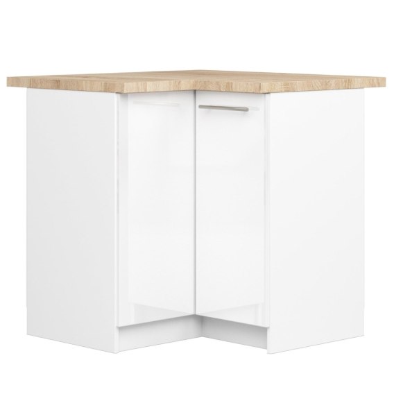 Kuchnia to pomieszczenie będące sercem każdego domu. To właśnie tutaj domownicy codziennie przygotowują liczne posiłki, oddając się rozmowom oraz spędzając razem czas. Nic więc dziwnego, że każdy chce swoją kuchnię urządzić w sposób zarówno funkcjonalny, jak i przyjemny dla oka. Meble pochodzące z kolekcji Oliwia z pewnością w tym pomogą. Prezentujemy jeden z elementów pochodzących właśnie z tego zestawu modułowego - szafkę narożną S90/90N zaprojektowaną w modnym kolorze białym z frontami biały połysk, z którym doskonale kontrastują czarne, matowe uchwyty, tworząc niepowtarzalną całość. Elegancki mebel umożliwia otworzenie drzwiczek na prawą oraz lewą stronę, dzięki czemu możliwe jest uzyskanie swobodnego dostępu do dużej przestrzeni, w której można umieścić wiele artykułów niezbędnych w każdej kuchni, środków czystości czy produktów spożywczych.