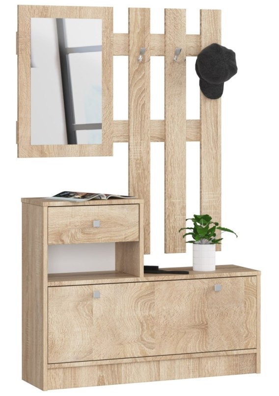Zestaw mebli do przedpokoju sprawi, że w mieszkaniu znów zapanuje ład i porządek. Koniec z porozrzucanym obuwiem i niechlujnie odłożonymi ubraniami. W pojemnej szafce zmieści się kilka par butów, a na wieszakach mogą zawisnąć kurtki i płaszcze wszystkich członków rodziny. Komplet został również wyposażony w duże lustro. Teraz przed każdym wyjściem z domu można się upewnić, czy ma się dobrze ułożoną fryzurę. Meble do przedpokoju z wieszakiem i szafką na buty są niezwykle funkcjonalnym i praktycznym rozwiązaniem. Zamiast samodzielnie kompletować zestaw, można postawić na sprawdzoną opcję, której zaufało już wielu konsumentów. Wszystkie nasze produkty zostały wykonane z bardzo dobrej jakości materiałów i charakteryzują się niezwykłą trwałością. Meble dąb sonoma do przedpokoju posiadają także wysokie walory estetyczne. Kolor drewna nadaje pomieszczeniu przytulnego, niepowtarzalnego klimatu. Zestaw będzie pasował zarówno do wnętrz rustykalnych, jak i tych o nowoczesnym i minimalistycznym stylu.